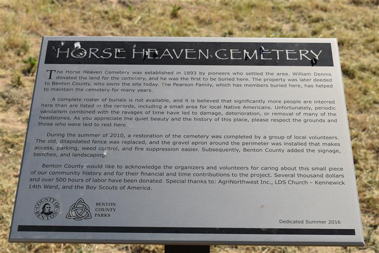 Added to the parks portfolio in 2012, Horse Heaven Cemetery is a two-acre decommissioned pioneer cemetery located about seven miles south of Benton City. Established in 1893 by the Dennis family, the cemetery has not had a burial since the 1940s. It has been challenged by the harsh conditions and the passage of time, but the County has been undertaking some modest restoration and beautification efforts in recent years to provide some dignity to the grounds and make it more of a point of interest.