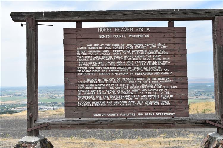 Horse Heaven Vista lies above Prosser along Highway 221 on the crest of the Horse Heaven Rim. A two-acre site, Horse Heaven Vista is essentially a viewpoint with a small paved and landscaped parking area and a modest shelter. Benton County has owned Horse Heaven Vista since the early 1960s,